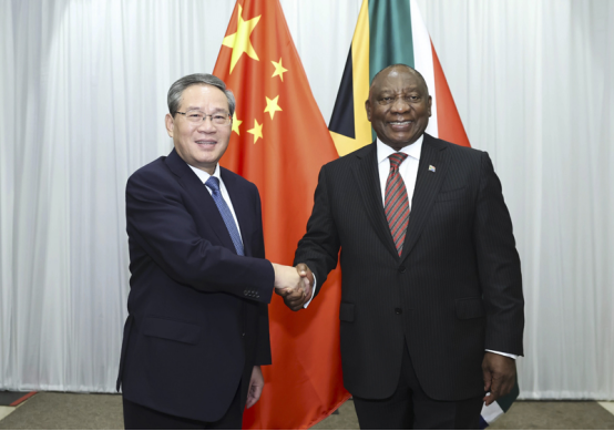 李强首先转达习近平主席对拉马福萨总统的亲切问候,表示数十年来,中国和南非亲如兄弟,友谊跨越山海,历久弥坚。在两国元首战略引领下,中南正携手推进新时代全方位战略合作伙伴关系,致力于造福两国人民。中方愿同南非一道继续努力,弘扬传统友谊,深化政治互信,坚定支持彼此核心利益和重大关切,拓展各领域合作,更好促进两国共同发展和中非团结合作。