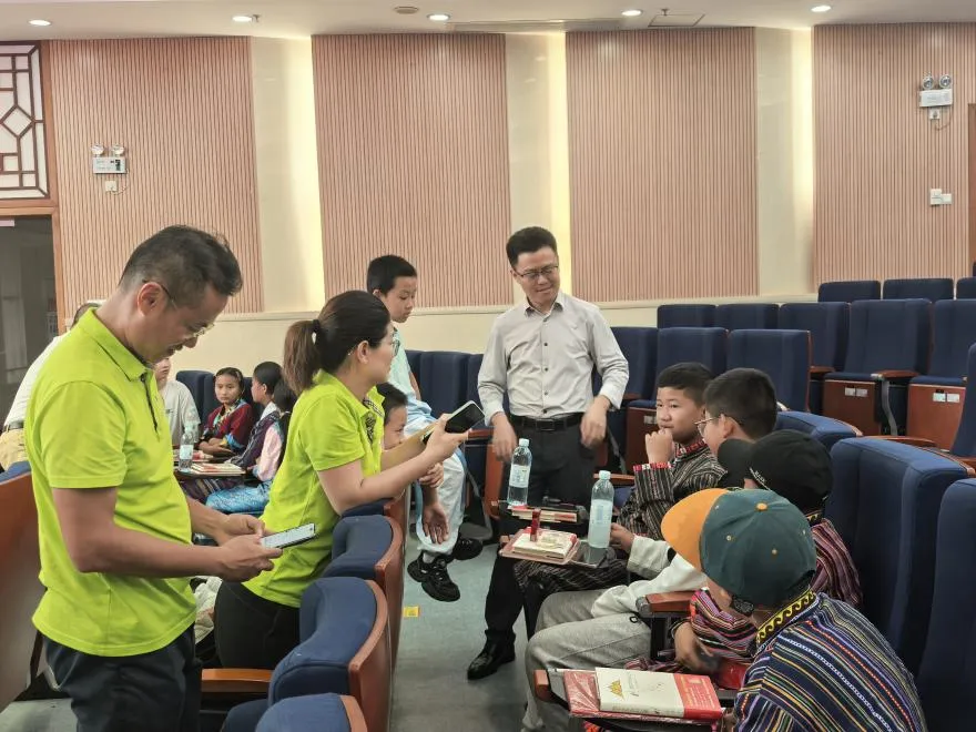 当天下午,中山大学岭南学院党委书记钟一彪在中山大学岭南堂主持召开爱心座谈会,捐赠爱心奖学金促成本次研学的校友代表也到场和民族“三交”团的孩子们谈心交流。座谈会上,钟一彪欢迎民族“三交”团的到来,并向孩子们介绍了中山大学和岭南学院的发展史。爱心校友与学生们亲切交流,了解他们的生活情况,并鼓励他们努力学习,未来可以飞出大山,看到外面的世界,更加感受到祖国的强大,希望他们从小树立大志,为民族复兴而努力学习。