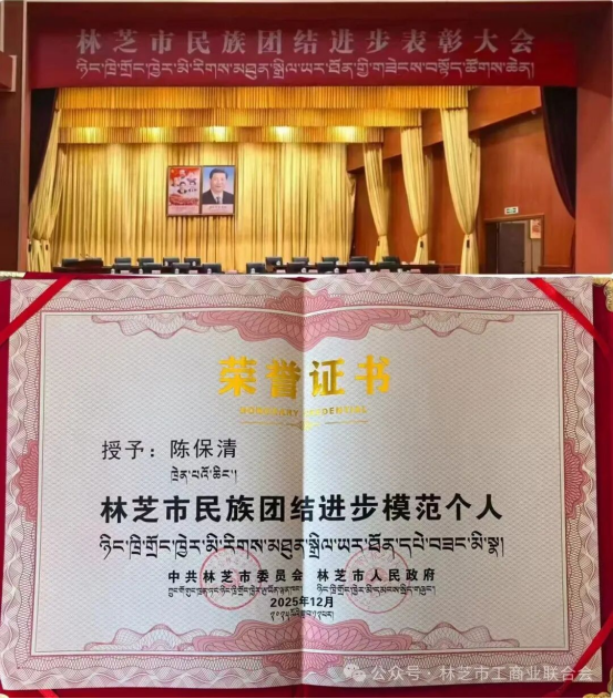 近年来,林芝市工商联始终将铸牢中华民族共同体意识作为工作核心,以促进民族团结进步为重要使命,积极发挥桥梁纽带作用,持续加强对广大民营企业家的思想引导与价值引领,通过搭建交流平台、选树先进典型、强化示范带动等举措,引导企业家主动投身民族团结进步事业。12月9日,林芝市工商联(总商会)会员企业负责人陈保清、汪贞华2名同志荣获“全市民族团结进步模范个人”荣誉称号,彰显了工商联会员在促进民族团结事业中的积极贡献。
