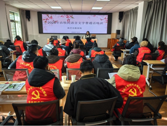 为深入贯彻落实习近平总书记关于推广普及国家通用语言文字的重要指示精神,服务铸牢中华民族共同体意识,加大国家通用语言文字推广力度,12月11日,林芝市教育局在太昭村组织开展2025年农牧民国家通用语言文字培训。