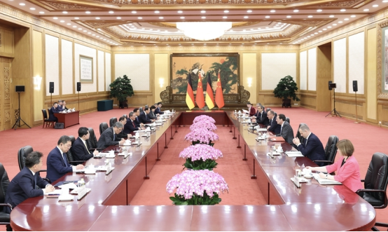 默茨表示,很高兴在中国农历马年春节之际,携重量级企业家代表团访华,这充分表明德方对深化德中经贸关系的高度重视和期待。德中两国相距遥远,但经济联系紧密,合作潜力巨大。德方愿本着坦诚开放精神,同中方加强高层交往,保持各领域常态化对话,推动双边经贸关系均衡、持续发展,促进绿色转型、应对气候变化等领域合作。德方愿同中方加强沟通协调,共同倡导多边主义和自由贸易。德方愿为推进欧中关系发展发挥积极作用。