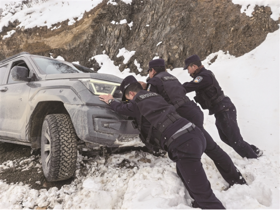 抵达现场后,民辅警立即安抚被困群众情绪,叮嘱车内人员做好防寒保暖,并迅速开展救援,为排量较小车辆安装防滑链、协力推车脱困,对受困车辆集中、路况复杂的路段,采取警车带道、压速护航的方式,引导所有车辆安全有序通过积雪危险路段。