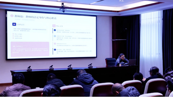 活动中,工作人员围绕《中华人民共和国宪法》《中华人民共和国教育法》《中华人民共和国未成年人保护法》等法律法规进行了深入浅出地讲解。并结合校园安全、学生伤害事故处理等典型案例,重点解读了教师在教育教学过程中的法定职责、权利边界以及侵权责任认定,引导教师运用法治思维处理家校矛盾和学生问题。