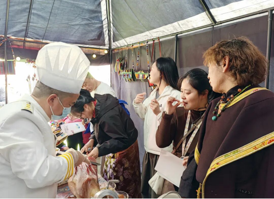 特色产品展示区里,藏香猪火腿、松茸、墨脱茶叶等特色好物琳琅满目;互动体验区中,游客们体验工布服饰、工布响箭等非遗项目,沉浸式感受林芝的民俗魅力。