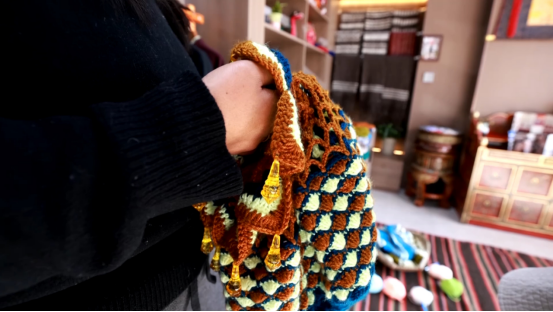 跟边巴卓玛一样,朱慧珍也参与了尼池社区“阿佳学堂”的培训。朱慧珍经营着一家超市,因为要照看生意,闲不住的她喜欢上了钩织,每天钻研钩法。她钩织的珞巴风格挎包、卡通挂件颇受年轻消费者的青睐。
