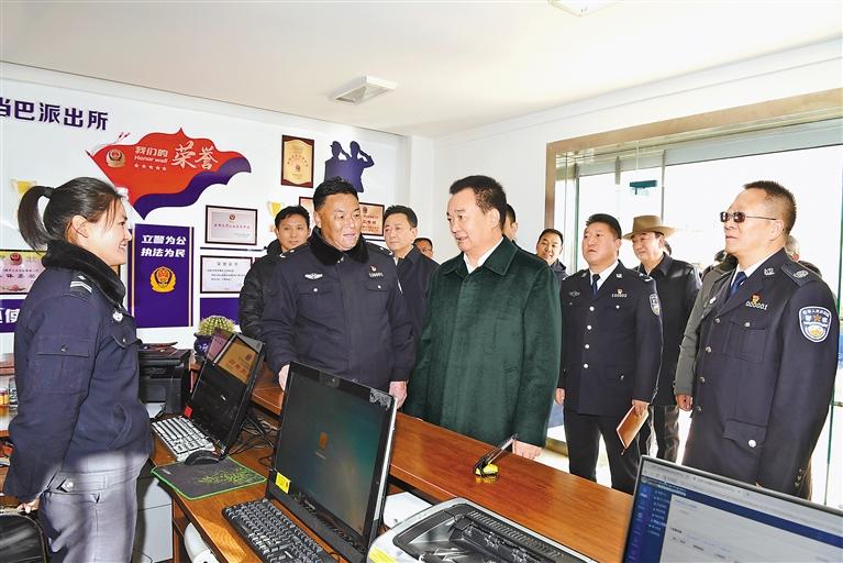春节、藏历新年期间,自治区党委书记王君正看望慰问基层一线干部群众。这是王君正在当巴派出所办证大厅,亲切看望慰问坚守岗位的公安民辅警。