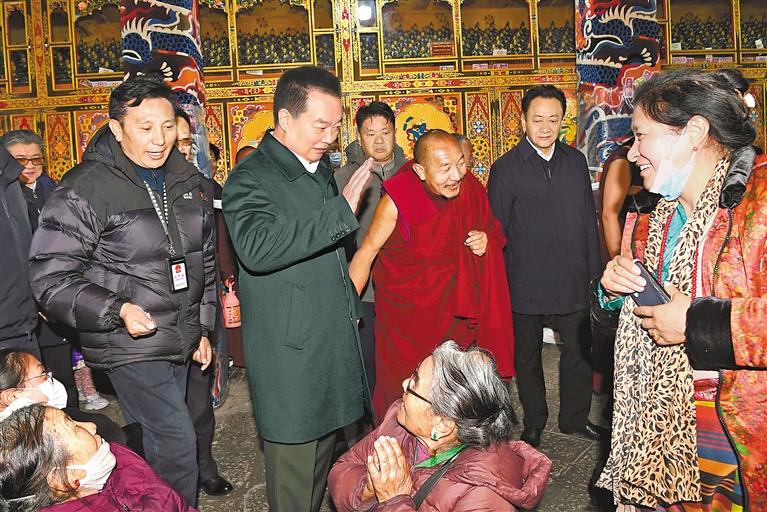 春节、藏历新年期间,自治区党委书记王君正看望慰问基层一线干部群众。这是王君正在哲蚌寺与群众和游客亲切攀谈、向他们挥手致意,祝愿他们在新的一年生活越来越美满、日子越过越红火。