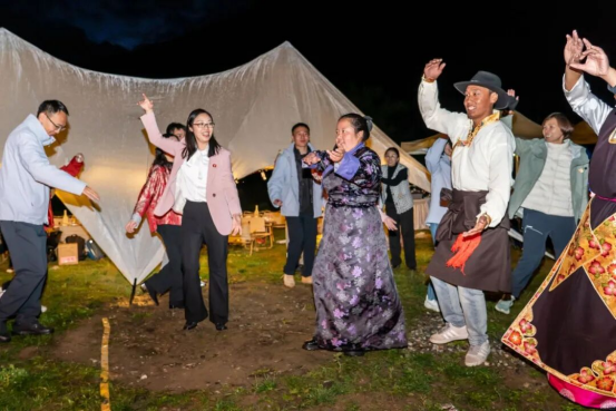 一团熊熊篝火被瞬间点燃,跃动的火焰照亮了夜空,也点燃了援藏干部和家属们的热情。在藏南桃谷的草坪上,援藏干部与家属们手拉着手,围绕着熊熊燃烧的篝火,形成了数个同心圆。伴随着欢快的藏族歌曲,大家踏着整齐的节拍,跳起热情洋溢的锅庄舞。笑声、歌声、脚步声交织在一起,汇成了一片欢乐的海洋。篝火映照着脸庞,大家载歌载舞,品尝可口的月饼,遥望美丽的月亮,共享团圆、欢聚的喜悦。