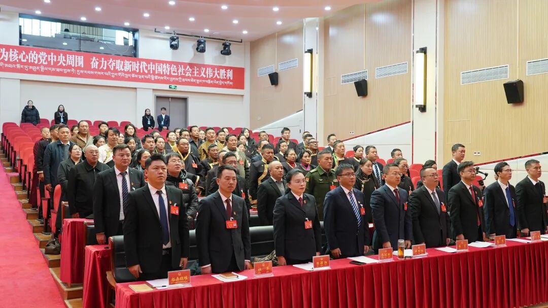 大会执行主席颜世辉、白珍、陈冬、巴珠、何萍、孙诚春、林布、次桑、王玉荣在主席台前排就座。多吉扎西和大会主席团成员在主席台就座。大会执行主席白珍主持会议并讲话。