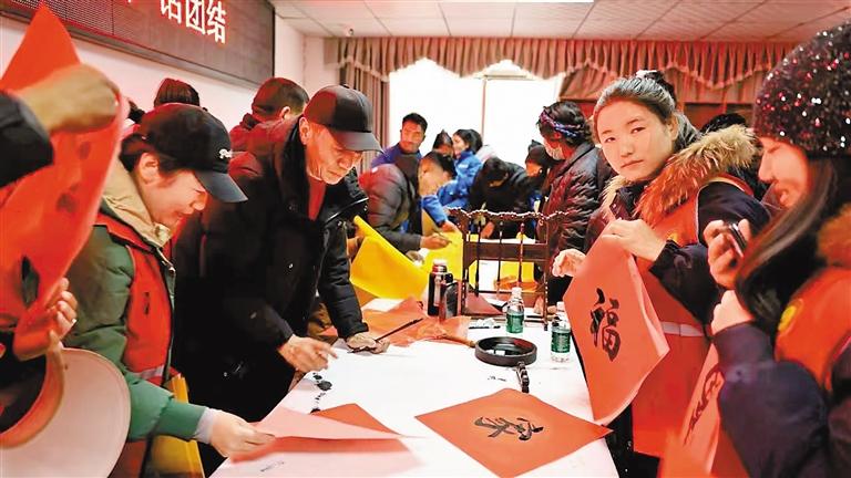 加查县新时代文明实践中心开展“闹元宵 话团结”活动,志愿者们与群众一同用毛笔书写美好寄语。