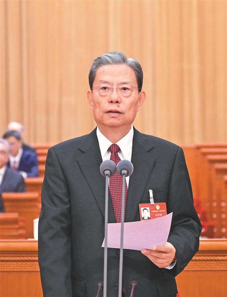 赵乐际说,我们要立足人大职能职责,坚持党的领导、人民当家作主、依法治国有机统一,践行全过程人民民主,坚持好、完善好、运行好人民代表大会制度,切实发挥国家根本政治制度优势,认真履行宪法法律赋予的职责,为实现“十五五”目标任务提供法治保障;人大代表要忠实代表人民利益和意志,依法履职尽责,密切联系群众,在本职岗位上建功立业、作出贡献。