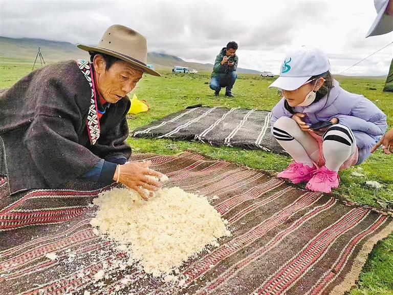 图为游客在玛如村观看当地牧民制作奶渣。本报记者 丹增平措 摄