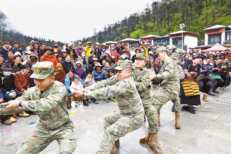 图为洛扎县干部群众和驻地官兵举行拔河比赛,共同营造军地团结一心、积极向上的民族团结社会氛围。