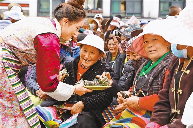 图为今年端午节期间,洛扎县委宣传部、县文旅局在德玛龙村举办“培树文明向上新风·崇尚健康幸福生活”系列活动,为新村居民送粽子,以弘扬传统节日文化凝聚民族团结奋进力量。