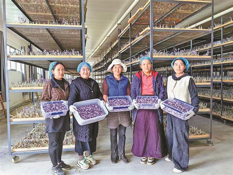 图为藏红花种植基地工作人员展示刚采摘下来的藏红花。本报记者 谢筱纯 刘枫 摄