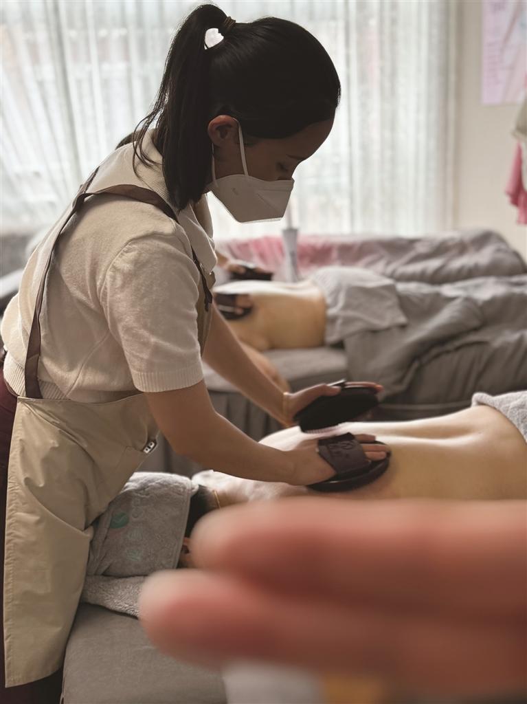 记者到访时,何菊正和员工为顾客芮女士做肩颈调理。她掌心搓热蘸取精油,从风池穴起,以滚、按、揉、推的手法循序渐进地进行操作,力度均匀流畅,眼神专注而认真,每推拿片刻便停下询问感受。