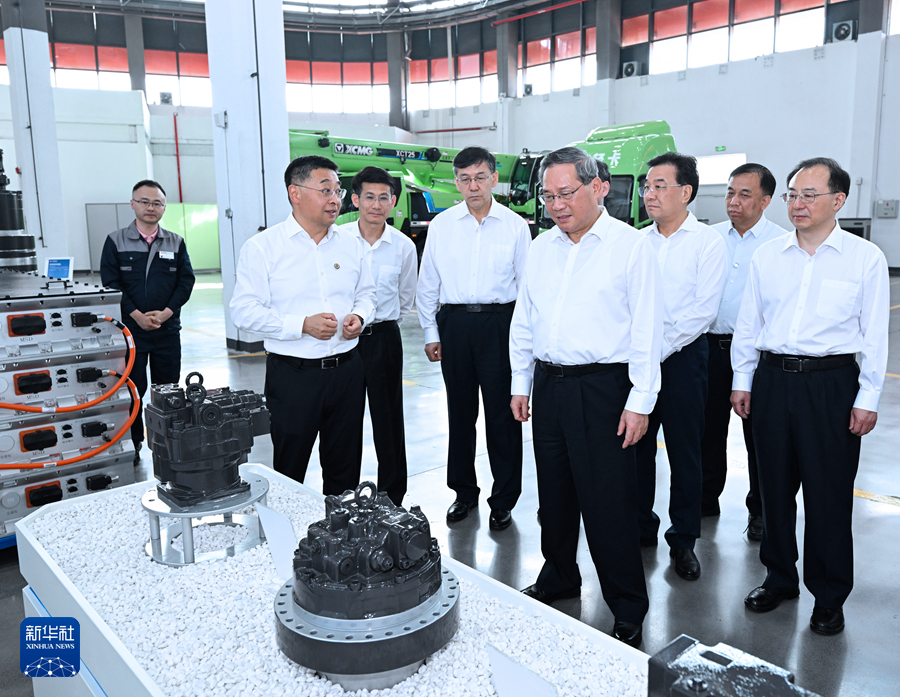 6月16日至18日,中共中央政治局常委、国务院总理李强在江苏调研。这是6月16日,李强在徐州江苏汇智高端工程机械创新中心有限公司,听取实验项目等汇报,察看核心零部件和产品。新华社记者 饶爱民 摄