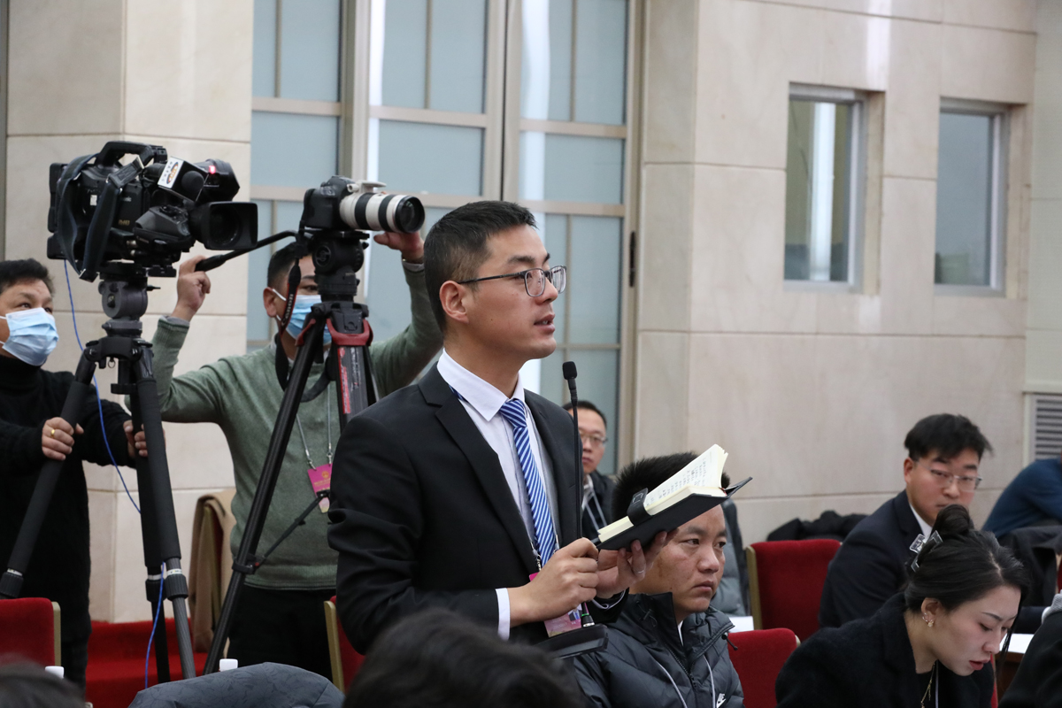图为记者正在向新闻发言人提问。